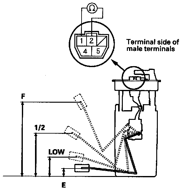 10. Measure resistance between fuel tank unit 5P connector terminals No. 1 and No. 2 with the float at E (EMPTY), LOW (LOW FUEL INDICATOR), 1/2 (HALF FULL), and F (FULL) positions. If you do not get the following readings, replace the fuel gauge sending unit.