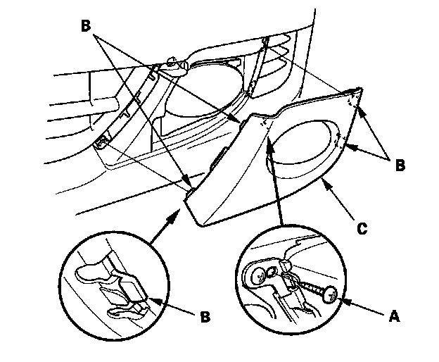 2. Remove the screw (A), and release all of the hooks (B) then remove the front fog light cover (C).