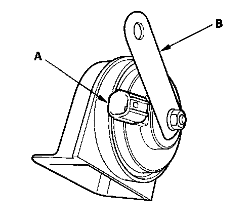 3. Test the horn by connecting battery power to the terminal (A) and grounding the bracket (B). The horn should sound.