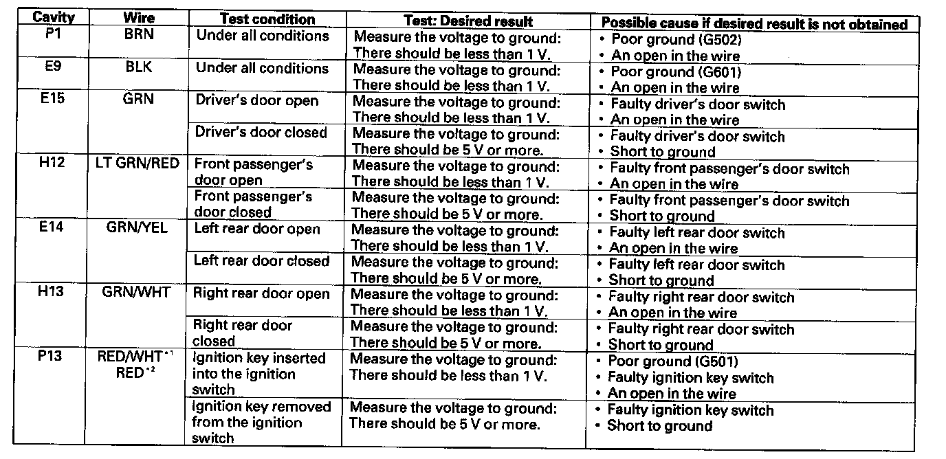 10. Reconnect the connector to the door multiplex control unit, turn the ignition switch ON (II), and make these input tests at the connector.