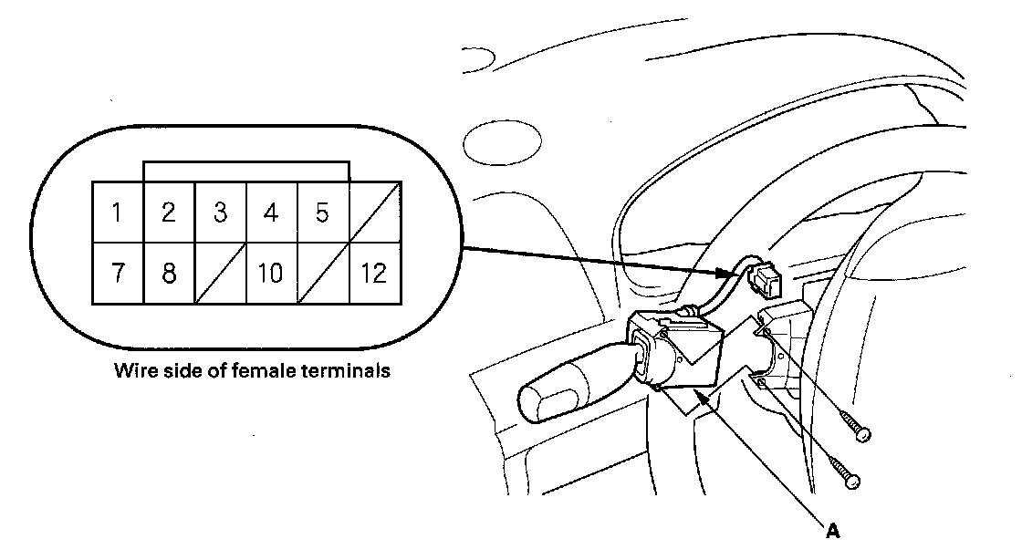 3. Disconnect the 12P connector (A) from the wiper/washer switch (B).