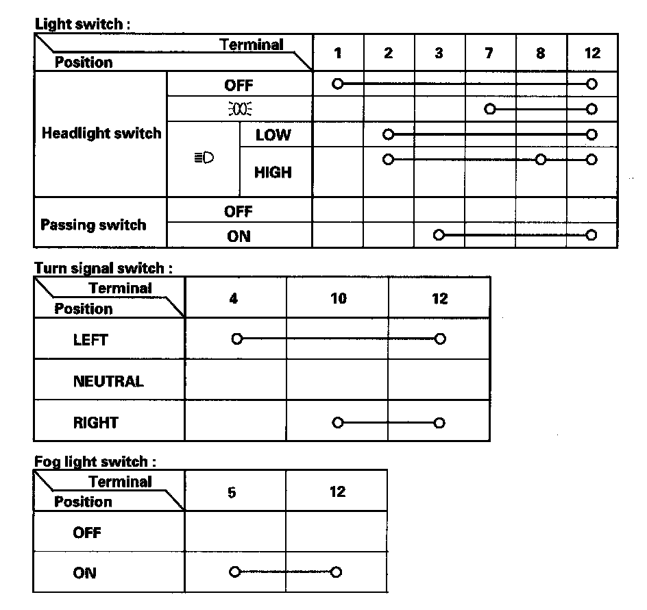 - If the terminals look OK, check for continuity between the terminals in each switch position according to the tables.