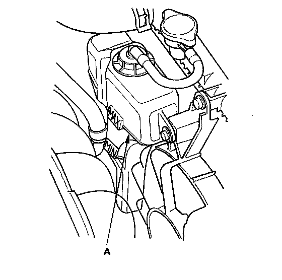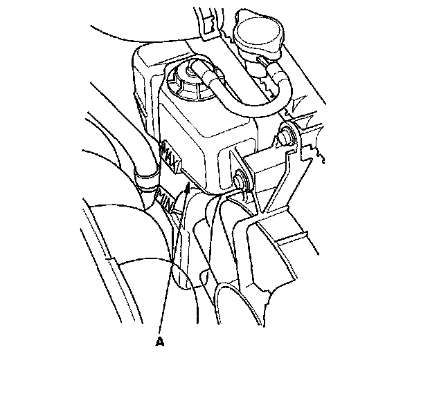6. Fill the coolant reservoir to the MAX mark (A) with Acura Long Life Antifreeze/Coolant Type 2 (P/N OL999-9001).