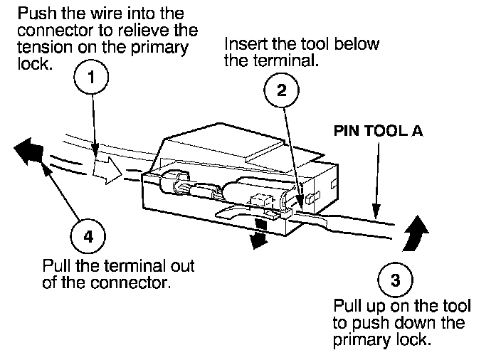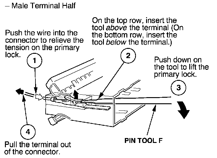 Before you begin, inspect the wire you are about to repair for damage and length. Make sure the wire will be long enough to make a terminal repair without stretching it when you reinstall the terminal in the connector. If the wire is too short, or if access to the connector is too restricted to make a terminal repair, you may need to install a pigtail terminal (a short length of wire with a factory-crimped terminal on it). Refer to HOW TO INSTALL PIGTAIL TERMINALS.