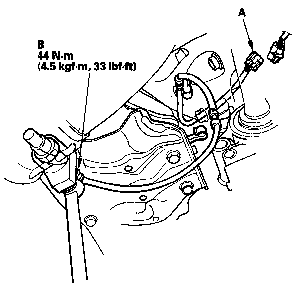 1. Disconnect the A/F sensor 4P connector (A), then remove the A/F sensor (B).