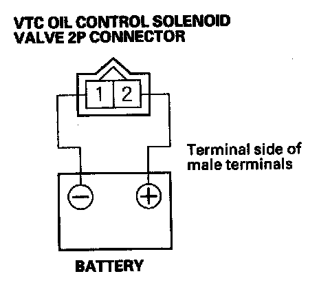 5. Connect the battery positive terminal to VTC oil control solenoid valve 2P connector terminal No. 2.