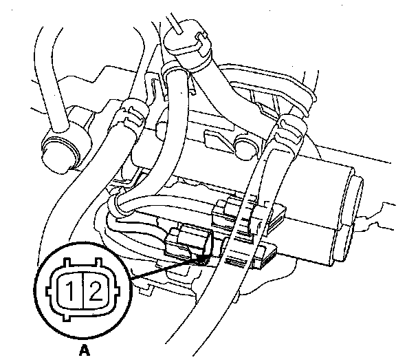 14. Connect the battery positive terminal to A/T clutch pressure control solenoid valve B connector terminal No. 1, and connect the battery negative terminal to the No. 2 terminal. Make sure A/T clutch pressure control solenoid valve B moves.