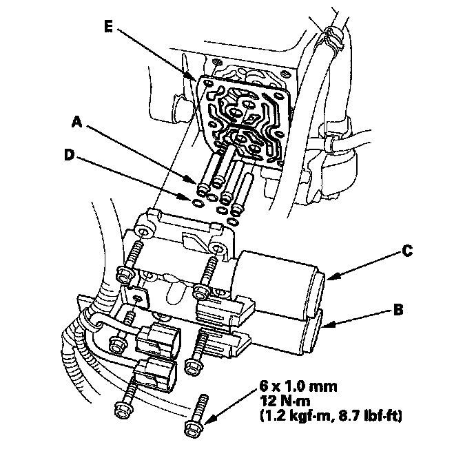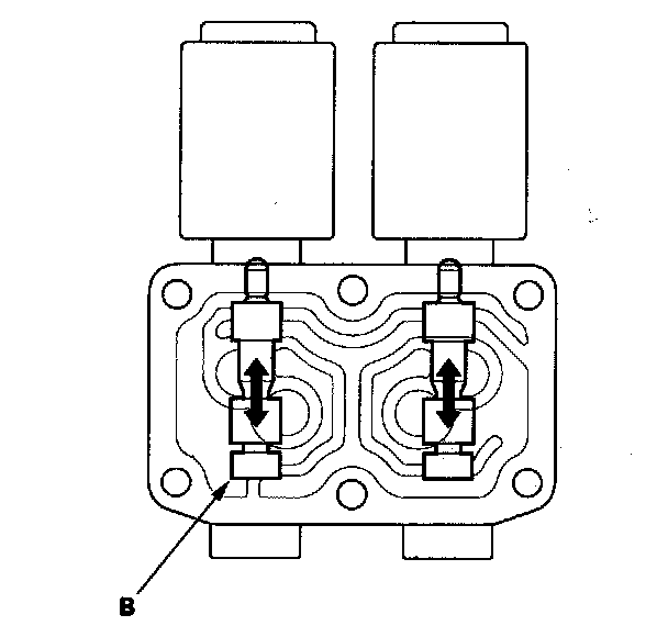 NOTE: You can see valve movement through the fluid passage in the mounting surface of the A/T clutch pressure control solenoid valves B and C body.
