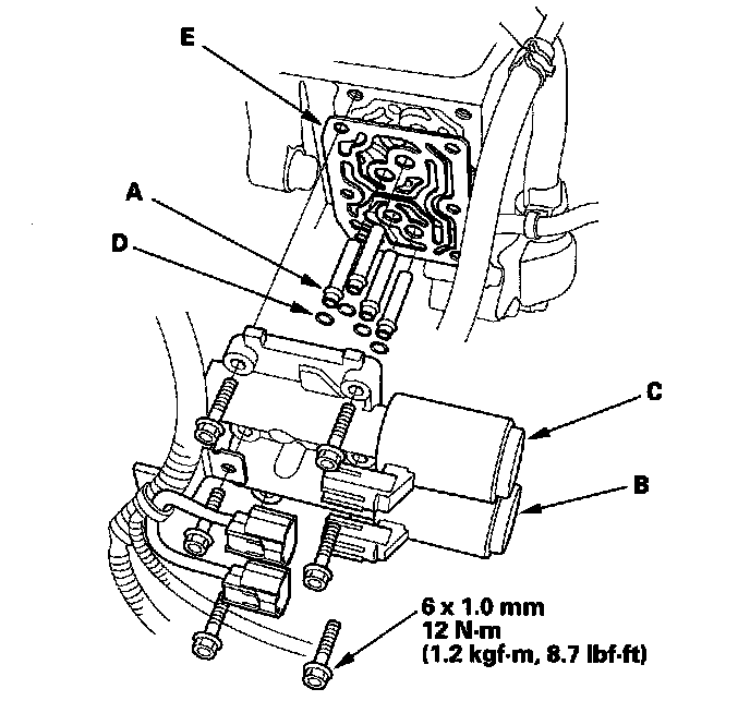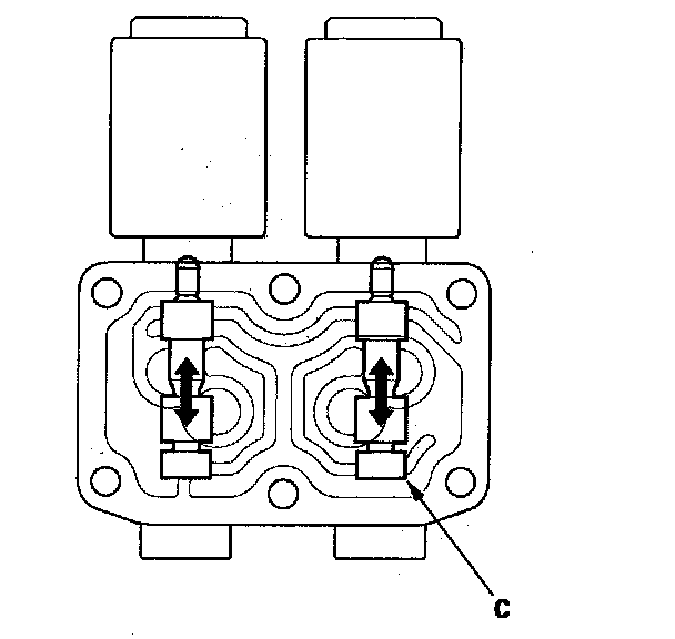 NOTE: You can see valve movement through the fluid passage in the mounting surface of the A/T clutch pressure control solenoid valves B and C body.