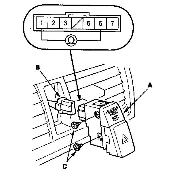 NOTE: Both illumination bulbs are connected in parallel. If there is continuity, remove the lower hazard switch illumination bulb, and recheck for continuity. If there is no continuity, replace the passenger's airbag cutoff indicator illumination bulb.