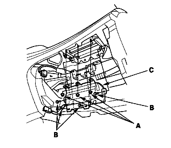 4. Remove the mounting nuts (A) and bolts (B) from the bracket. Remove the front passenger's airbag (C).