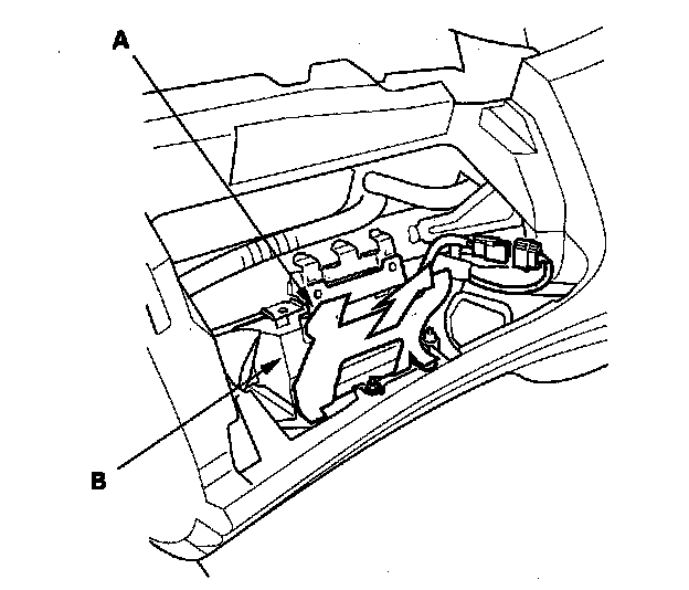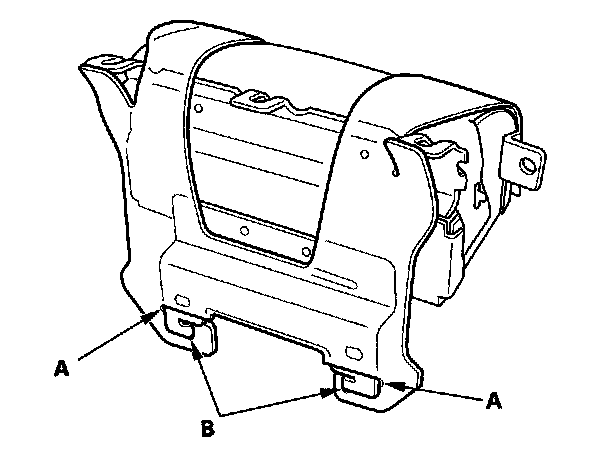 4. Place the new front passenger's airbag with the airbag protector (A) into the mounting bracket on the dashboard, and install the center nut (B) by hand. Do not fully tighten it.