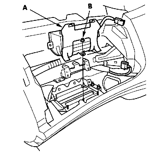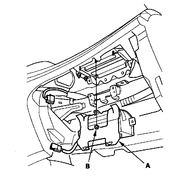 6. Place the new front passenger's airbag with the airbag protector (A) into the mounting bracket on the dashboard, and install the center nut (B) by hand. Do not fully tighten it.