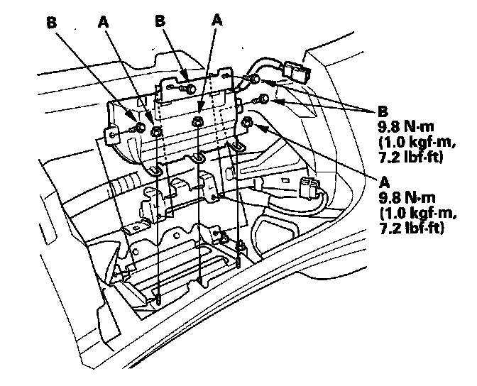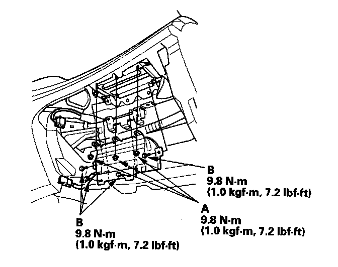 8. Tighten the front passenger's airbag mounting nuts (A) and bolts (B) to the specified torque.