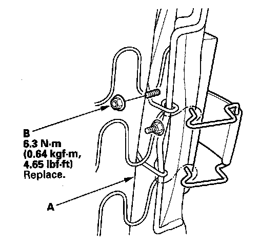 1. Place the new side airbag on the seat-back frame (A). Tighten the new side airbag mounting nut (B).