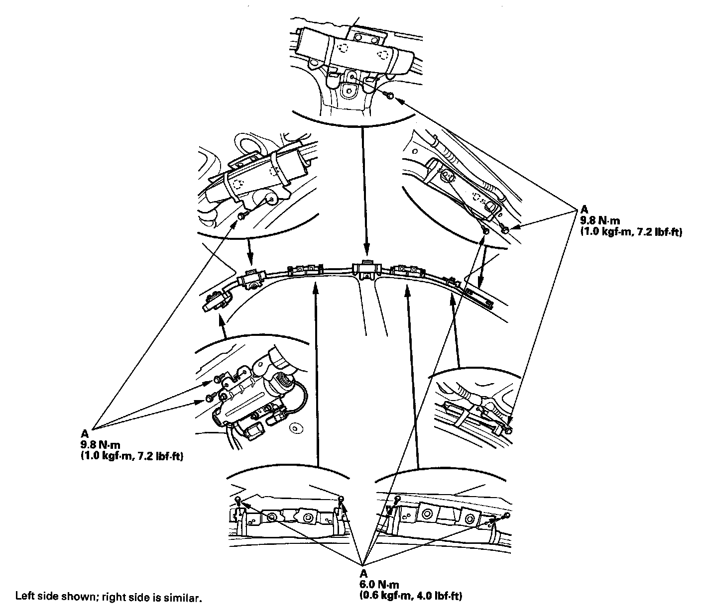 1. Place the new side curtain airbag assembly on the side of the roof. Tighten the side curtain airbag mounting bolts (A).