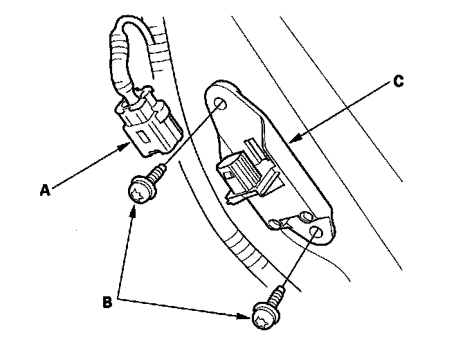 1. Install the new side impact sensor (second) (A) with the TORX bolts (B), then connect the side curtain airbag harness 2P connector (C) to the side impact sensor (second).
