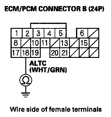13. Check for continuity between ECM/PCM connector terminal B18 and alternator 4P connector terminal No. 2.
