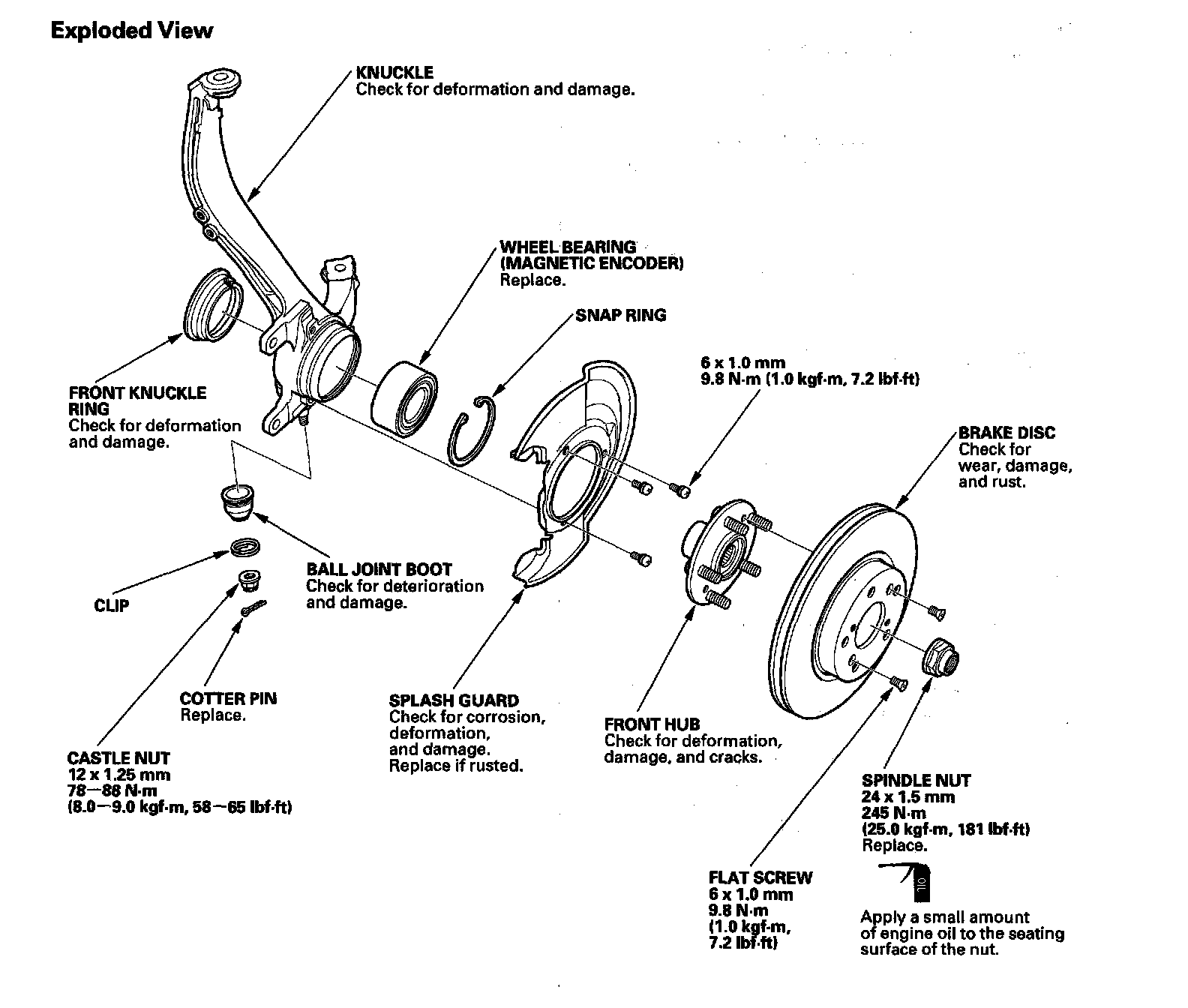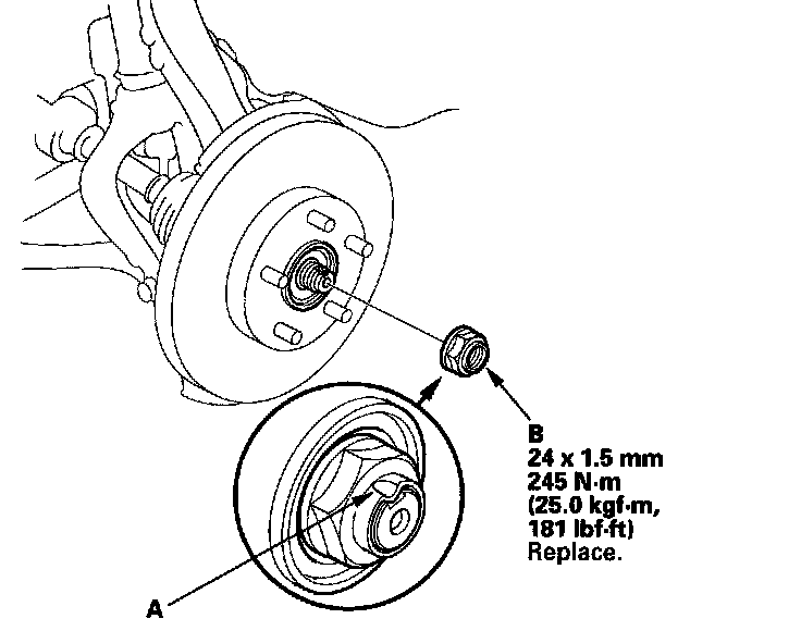 ^ Before installing the spindle nut, apply a small amount of engine oil to the seating surface of the nut. After tightening, use a drift to stake the spindle nut shoulder against the driveshaft.
