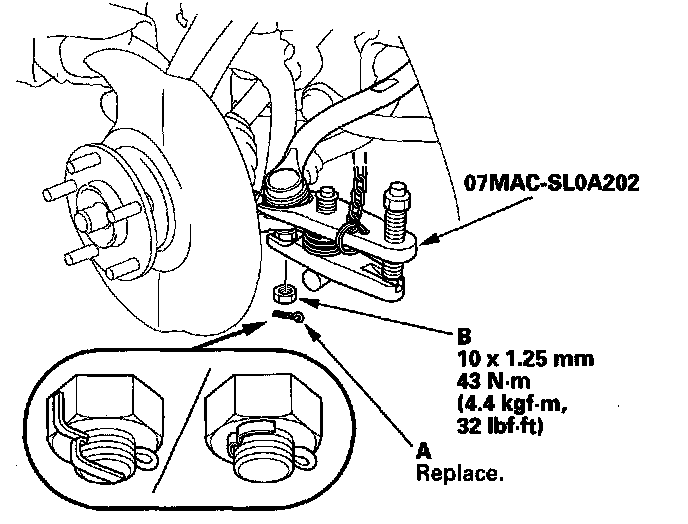 ^ First install all of the components, and lightly tighten the bolts and nuts, then raise the suspension to load it with the vehicle's weight before fully tightening to the specified torque values. Do not place the jack against the ball joint pin of the knuckle.