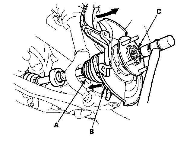 15. Remove the driveshaft outboard joint (A) from the knuckle (B) by tapping the driveshaft end (C) with a soft face hammer while drawing the hub outward, then remove the knuckle.