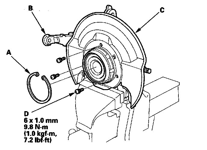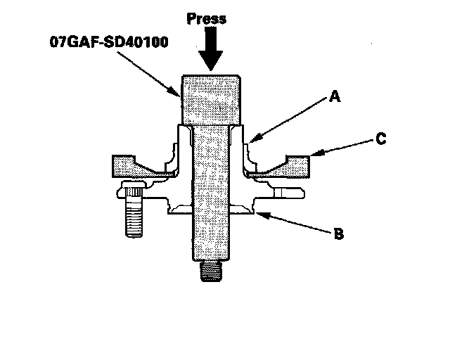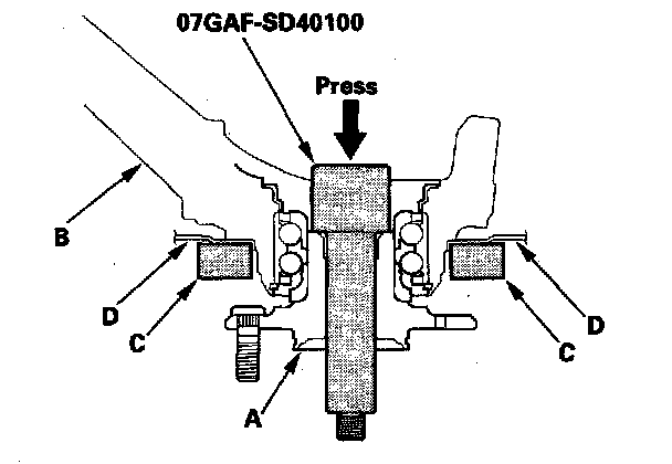 1. Separate the hub (A) from the knuckle (B) using the hub dis/assembly tool and a hydraulic press. Hold the knuckle with the attachment (C) of the hydraulic press or equivalent tool. Be careful not to deform the splash guard (D). Hold onto the hub to keep it from falling when pressed clear.