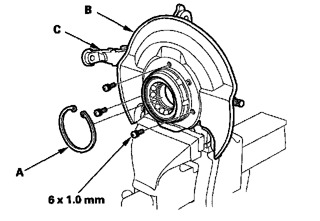 3. Remove the snap ring (A) and the splash guard (B) from the knuckle (C).