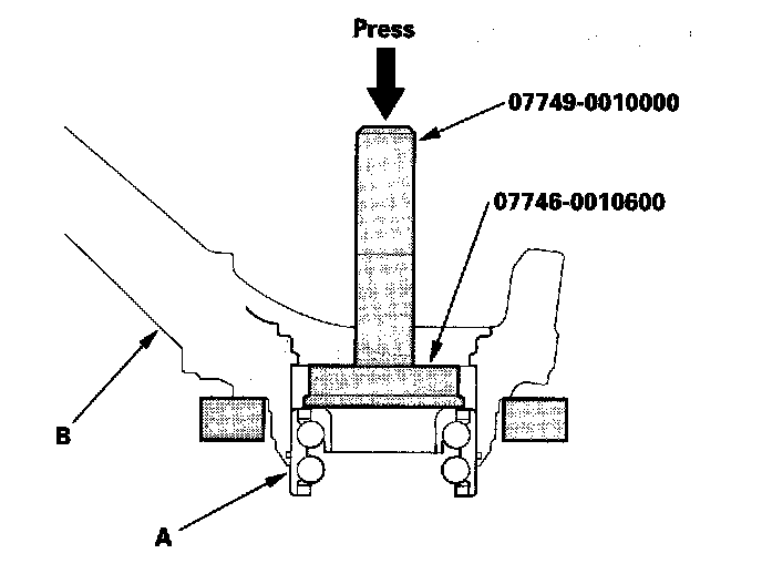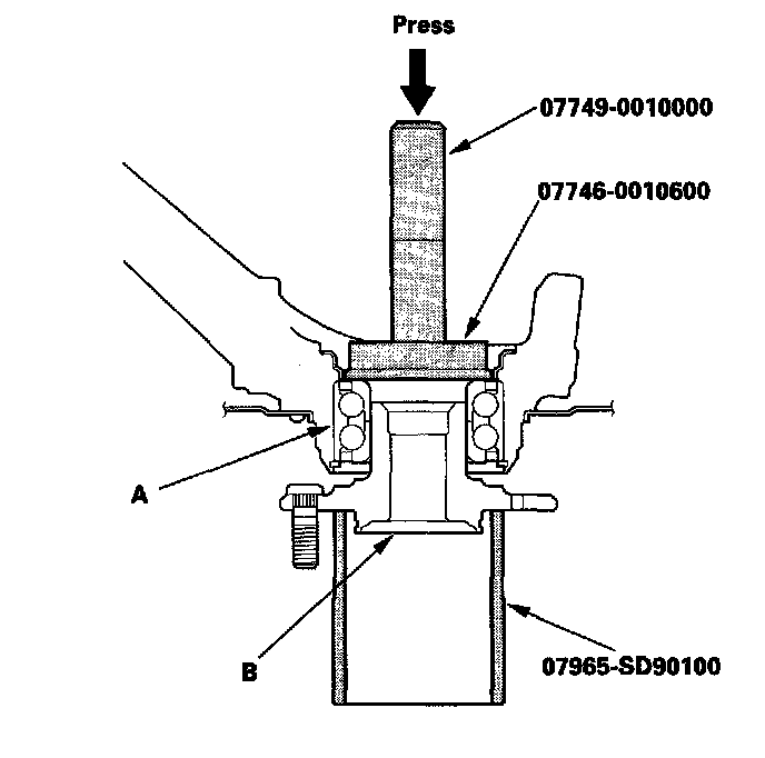5. Press the wheel bearing (A) out of the knuckle (B) using the attachment, the driver, and a press.