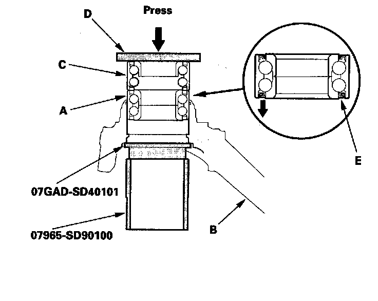 7. Press a new wheel bearing (A) into the knuckle (B) using the old bearing (C), a steel plate (D), the attachment, the support base, and a press.