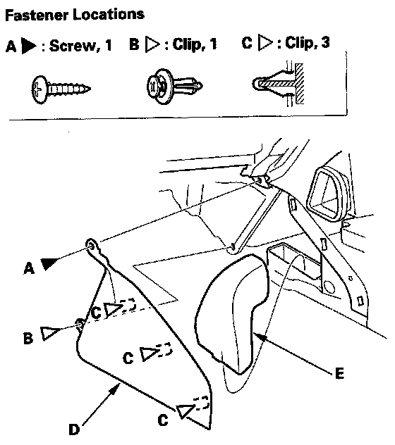 4. Remove the screw (A) and release the clips (B,C), then remove the driver's center lower cover (D) and the rear vent duct (E).