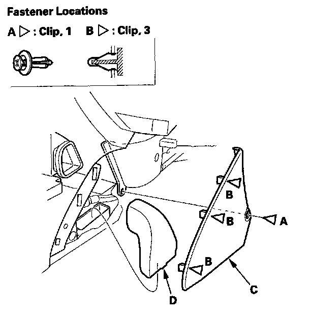 5. Release the clips (A, B), then remove the passenger's center lower cover (C) and the rear vent duct (D).