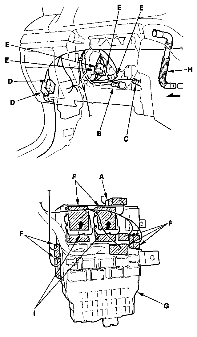 7. From under the dash, disconnect the roof wire harness connector (A), clutch switch connector (B) (on M/T model), and brake pedal position switch connector (C), floor wire harness connectors (D), engine compartment wire harness connectors (E), and disconnect the dashboard wire harness connectors (F) from the under-dash fuse/relay box (G), then release the wire harness clips. Disconnect the air hose (H).