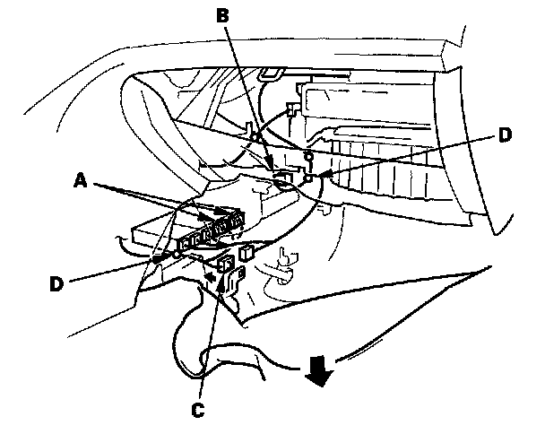9. From under the dash, disconnect the ECM/PCM connectors (A), power transistor connector (B), and engine wire harness connector (C), then release the wire harness clips (D).