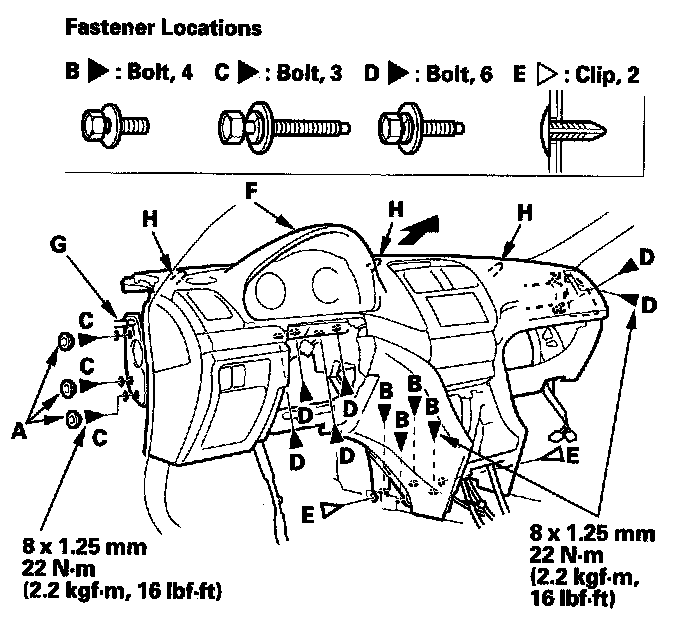 14. From outside the driver's door, remove the caps (A), then remove the bolts (B, C, D), and clips (E) and lift up on the dashboard/steering hanger beam (F) to release it from the guide pins (G, H).