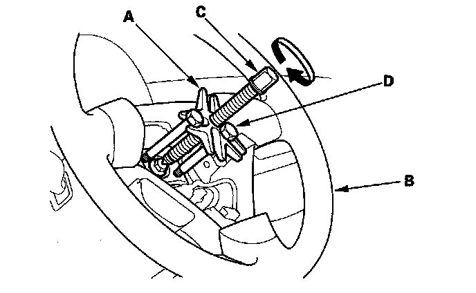 6. Install a commercially available steering wheel puller (A) on the steering wheel (B). Free the steering wheel from the steering column shaft by turning the pressure bolt (C) of the puller.