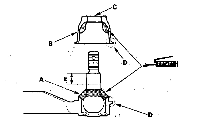 ^ Keep grease off the boot mounting area (D) and the tapered section (E) of the ball pin.
