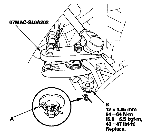 3. Remove the lock pin (A) from the upper arm ball joint, then remove the castle nut (B).