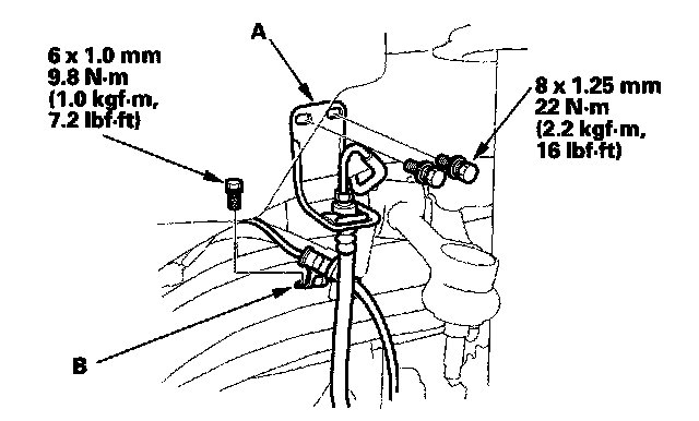 6. Remove the wheel sensor harness mounting bracket (B).