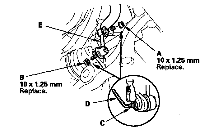 3. Remove the self-locking nut (A) and flange nut (B) while holding the respective joint pin (C) with a hex wrench (D), and remove the stabilizer link (E).