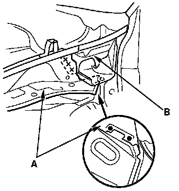 - Attach the patch (A) at the joint section of the wheelhouse upper extension (B), and weld it.