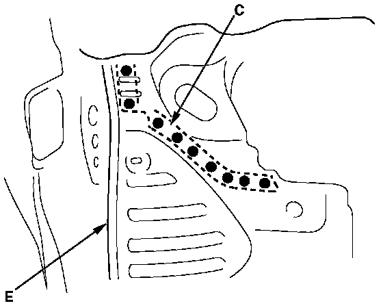 - From the passenger's compartment side, plug weld the holes in the dashboard lower (E) and damper housing (C).