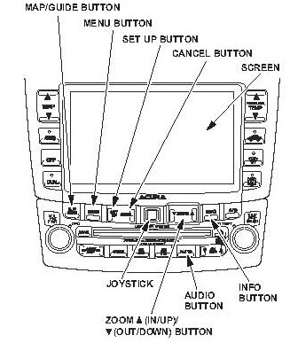 INFO button - Press this button to display the information menu for selecting Set-Up, Voice Command Help, Calendar, Calculator, and Map Legend.