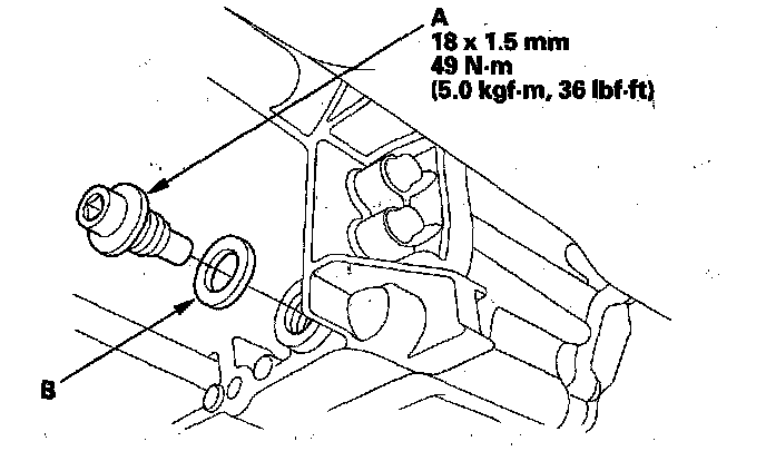 3. Remove the drain plug (A), and drain the automatic transmission fluid (ATF). Then reinstall the drain plug with a new sealing washer (B).