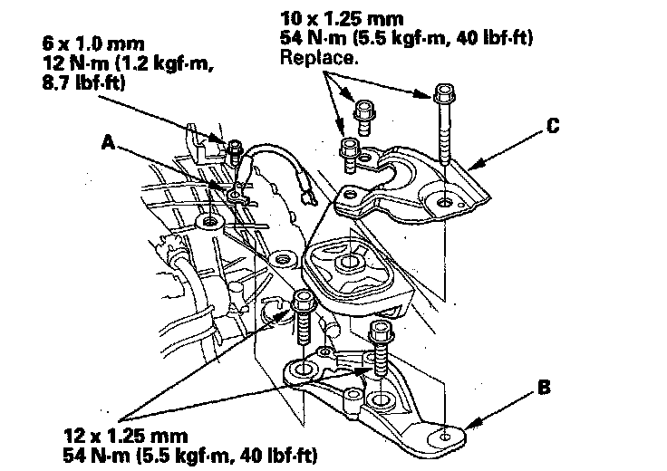 8. Remove the ground cable (A), the transmission upper mount bracket (B), and the bracket plate (C).