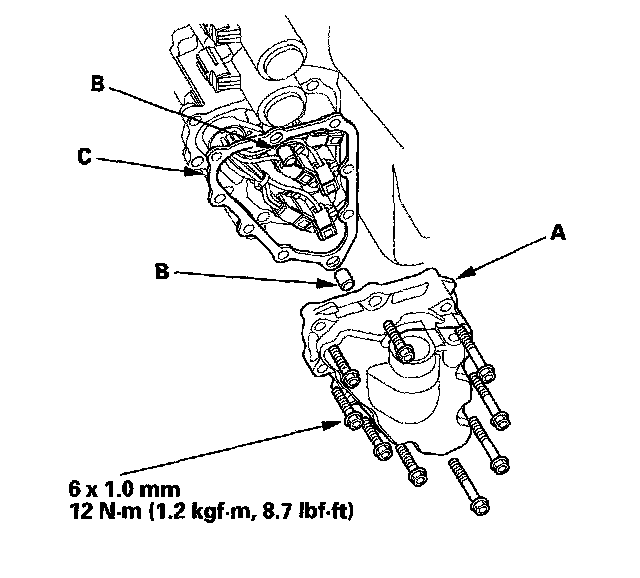 13. Remove the shift solenoid valve cover (A), the dowel pins (B), and the gasket (C).