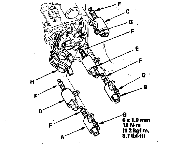 17. Install shift solenoid valves A and B. While holding the shift solenoid valve body, be sure to install the solenoid valves until their mounting brackets contact the bracket of the installed solenoid. Install the solenoid mounting bolts (G) and tighten them.