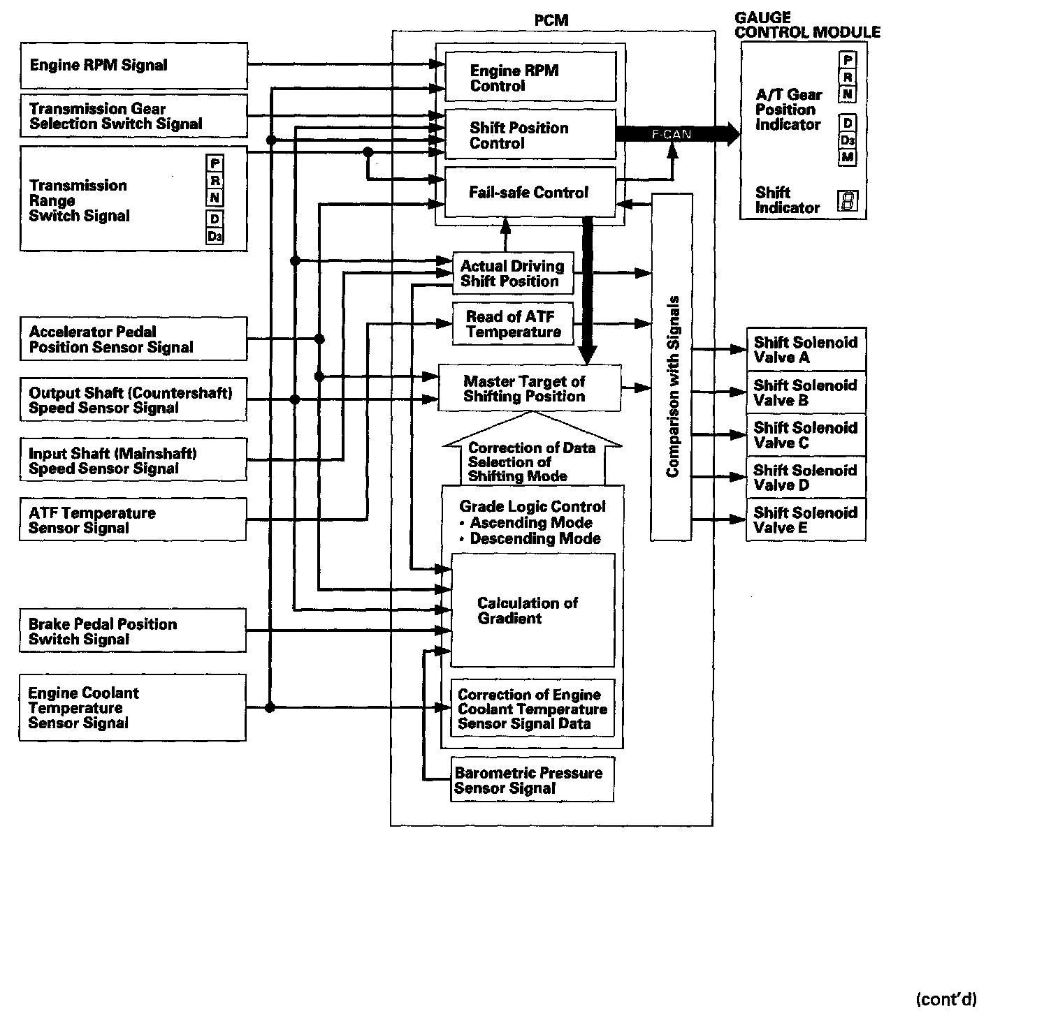 The PCM instantly determines which gear should be selected by various signals sent from sensors and switches, and it actuates shift solenoid valves A, B, C, D, and E to control gear selection.