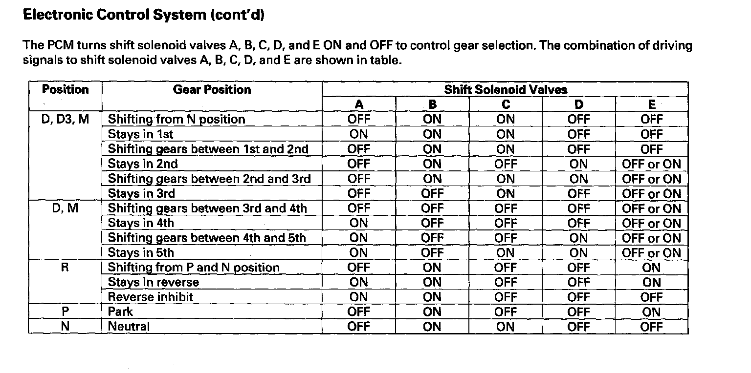 The PCM turns shift solenoid valves A, B, C, D, and E ON and OFF to control gear selection. The combination of driving signals to shift solenoid valves A, B, C, D, and E are shown in table.