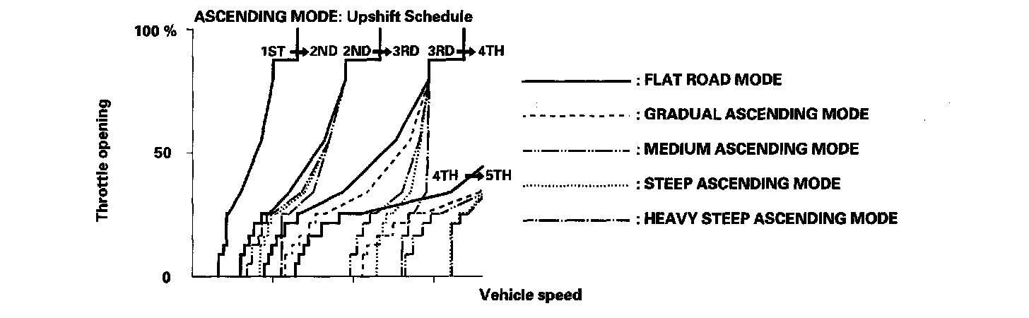 Shift schedules stored in the PCM between 2nd and 3rd gears, between 3rd and 4th gears, and between 4th and 5th gears, enable it to automatically select the most suitable gear according to the magnitude of a gradient.