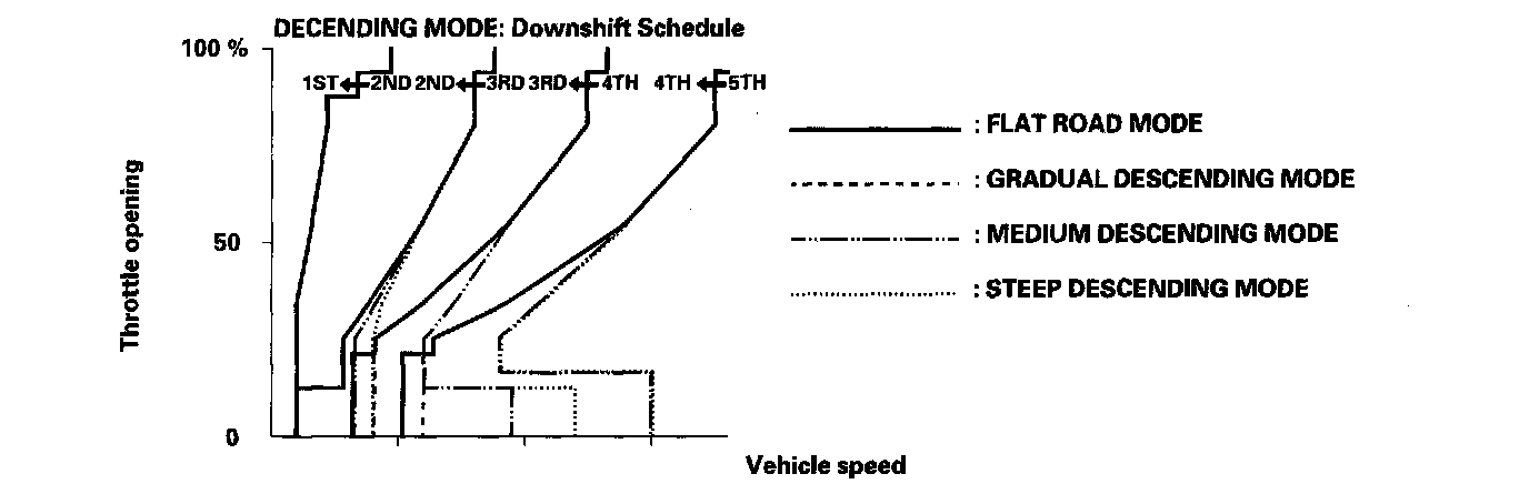 When the PCM determines that the vehicle is going down a hill in D and D3, the shift-up speed from 4th to 5th gear, from 3rd to 4th gear, and from 2nd to 3rd gear (when the throttle is closed) becomes faster than the set speed for flat road driving to widen the 4th gear, 3rd gear, and 2nd gear driving area. This, in combination with engine braking from the deceleration lock-up, achieves smooth driving when the vehicle is descending. There are three descending modes with different 4th gear driving areas, 3rd gear driving areas, and 2nd gear driving areas according to the magnitude of a gradient stored in the PCM. When the vehicle is in 5th gear or 4th gear, and you are decelerating when you are applying the brakes on a steep hill, the transmission will downshift to a lower gear. When you accelerate, the transmission will then return to a higher gear.
